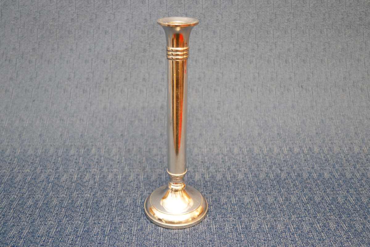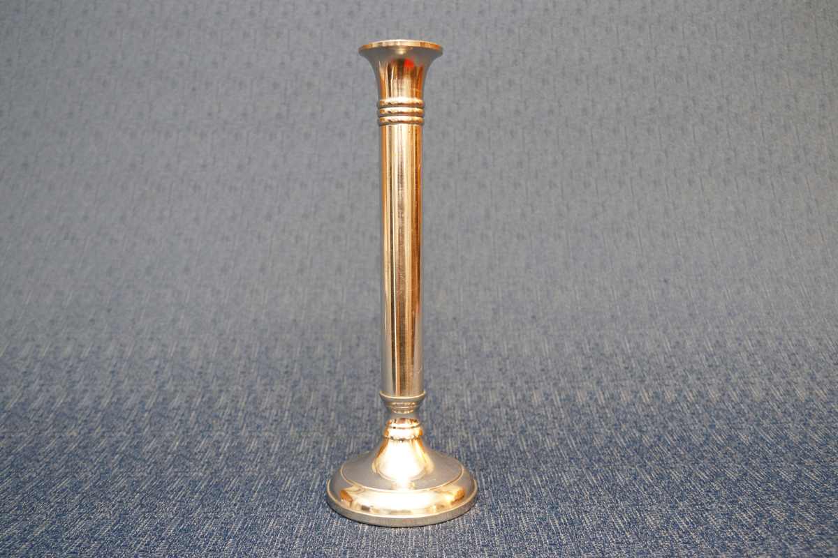 Korkea hopeanvärinen kynttilänjalka, korkeus 26,5 cm. Kaunis juhlapöytään! Siisti ja tyylikäs, perinteinen malli. Hinta 8 euroa.