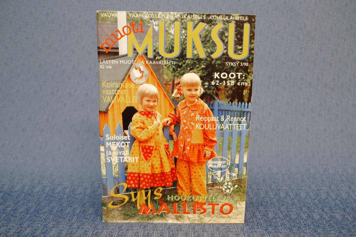 Hyväkuntoinen Muotimuksu syksy 3/98. Sivuja 67, kaavat yhä kiinni. Helppoja kaavoja lastenvaatteisiin väliltä 62-158 cm. Tässä numerossa paljon rentojen syysvaatteiden kaavoja. Nostalgiaa ja hyötyä samassa lehdessä, hinta 1 euroa.
