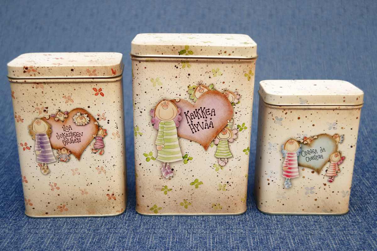 Hyväkuntoiset Enkelin Eväspussi-sarjan vanhat peltipurkit. Kyljissä tekstit “Iloa jokaiseen päivääsi”, “Kaikkea hyvää” ja “Onnea ja unelmia”. Korkeudet 16,5 cm, 14,5 cm ja 12 cm. Purkit ovat 2000-luvun alusta, jolloin Enkelin Eväspussi -sarja aloitti seinäjokelaisen lastenhoitajan ideoimana. Kyljissä olevat tummat kohdat eivät ole ajanpatinaa, vaan kuuluvat väritykseen. Purkkien pohjassa yhä myyjäliikkeen tarrat. Purkit myös sisältä hyväkuntoiset. Kolmen purkin yhteishinta 12 euroa.