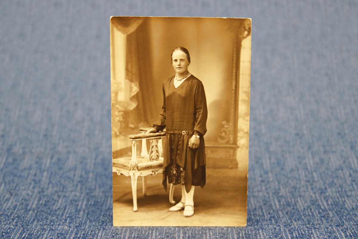 Vanha suomalainen valokuva noin 1920-luvulta. Kuvattu A.Strandbergin kuvaamossa Linnankadulla Turussa. Kuvaamo toimi vuosina 1901-1928. Siisti, hyväkuntoinen valokuva, jossa nuori nainen seisoo pyhävaatteissaan kuvaamon lavasteissa. Kuvan hinta 2 euroa.
