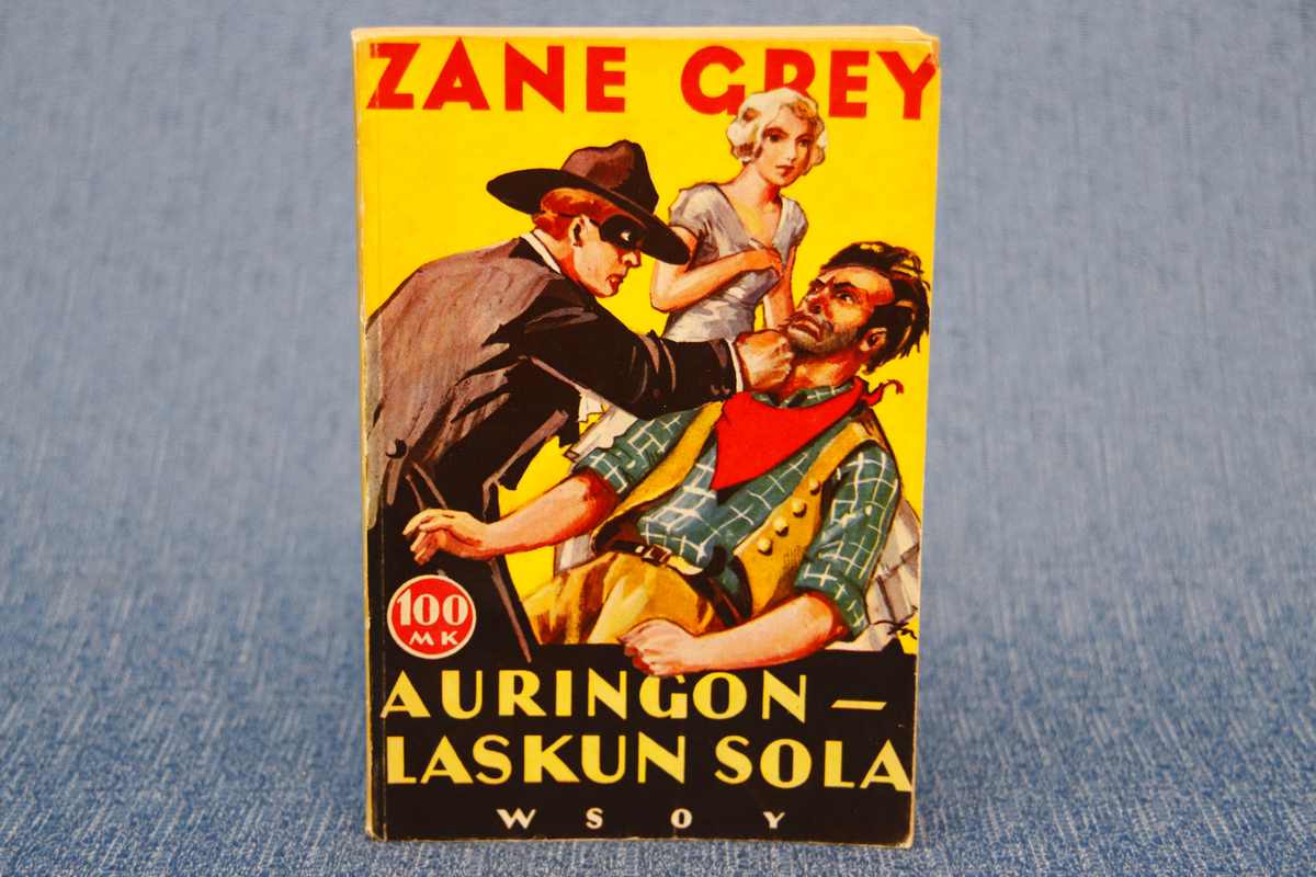 Zane Grey Auringonlaskun sola vuodelta 1953. Länteen sijoittuva seikkailupokkari. Kuului Riksin sarjaan, jossa julkaistiin aikansa suosikkiromaaneja seikkailunnälkäisille lukijoille. Siisti pokkari, jonka värikkään kannen voi vaikka kehystää. Pokkarin hinta 3 euroa.